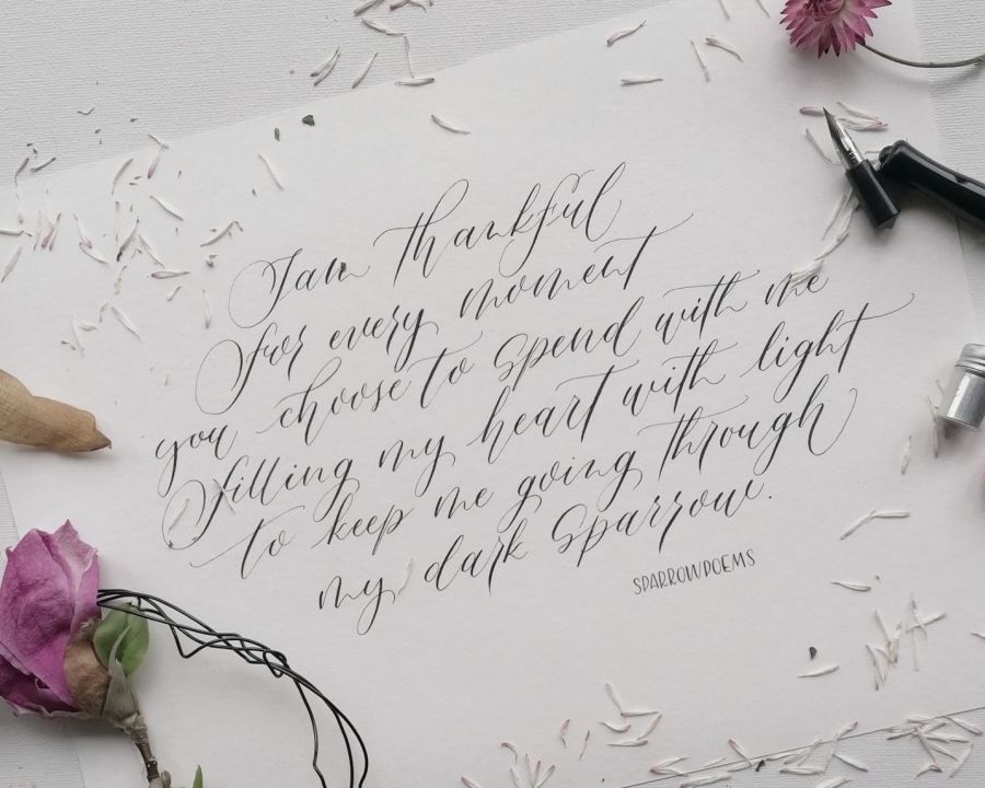 Aus der klassischen englischen Schreibschrift – Copperplate – heraus, gibt man der Schrift eine unverwechselbare Leichtigkeit. Im Gegensatz zur klassischen Schreibschrift, gibt es in der Moderne keine klaren Regeln. Jetzt meinst du sicher – oh das ist ja dann leichter? Da kann ich nur sagen JEIN – es ist freier, aber es spielen Harmonie, Gleichgewicht und Details eine viel größere Rolle und das macht es durchaus komplex.